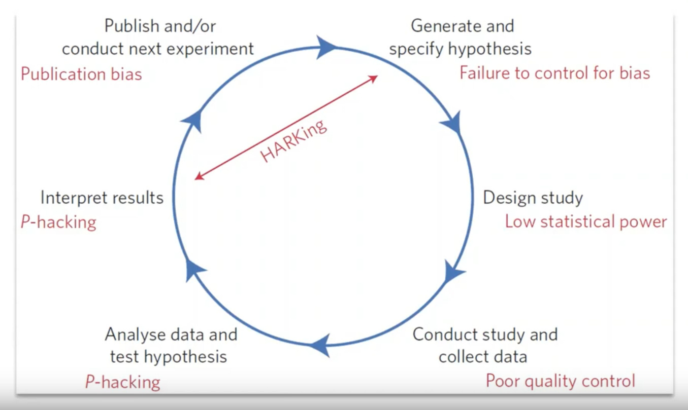 What the image above depicts is the head of a lab doing what has always worked: have a stream of grad students and postdocs attempt to farm data sets for publishable results. First one wins. Don’t worry what stage of the process you’re in. They’re all “on ramps” and you can always “revise your hypothesis.” The slide is what has, and perhaps should, end your career. It ended the career of USDA leader Brian Wansink who was just doing what everyone else was doing. It shouldn’t be part of the handpicked project to educate researchers on rigorous practices.