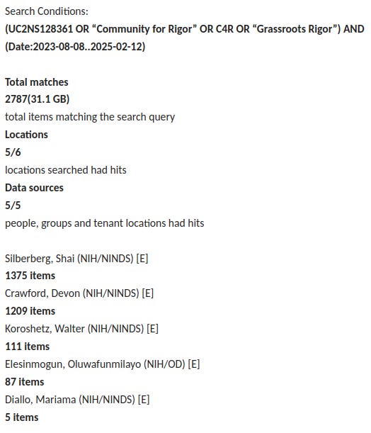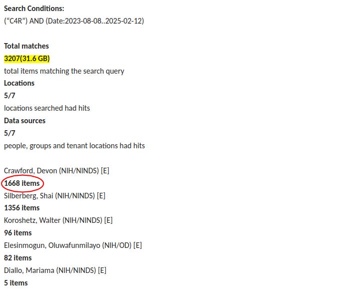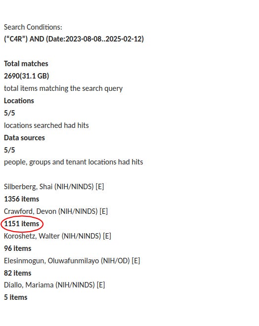 To recap, I was told my FOIA request for emails about NIH’s Community for Rigor project was returning too many records to be processed. This is because the short name for it, “C4R” was matching what the FOIA office called “junk.” About a month later, you sent the number of records for various searches. The number of records for the term “C4R” in conjunction with other search terms was lower than “C4R” alone. I told you this was impossible by normal search term logic and you said you had noticed this already and were investigating. That was two weeks ago.