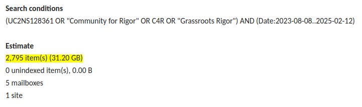 The numbers had been changed and the formatting was consistent this time. There was no mention of the changes in the email. The impossibility of adding more “OR” terms and getting fewer results had been fixed, so to speak, due to the deletion of 517 emails from program officer Devon Crawford’s total.