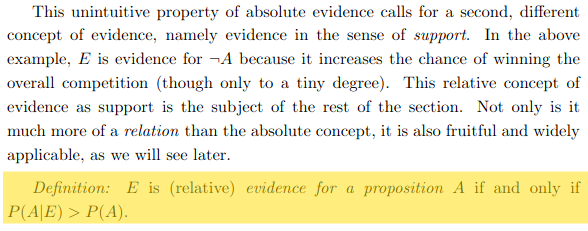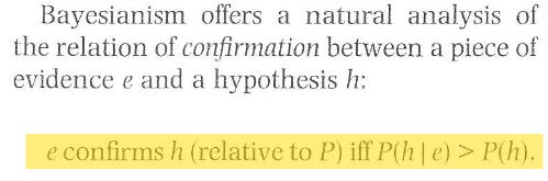 “If one measures confirmation in terms of increase in degrees of belief, as Bayesians typically do, T is confirmed by E whenever P(T|E) > P(T). Throughout the paper, we use this inequality as a criterion for when a piece of evidence confirms a hypothesis.”