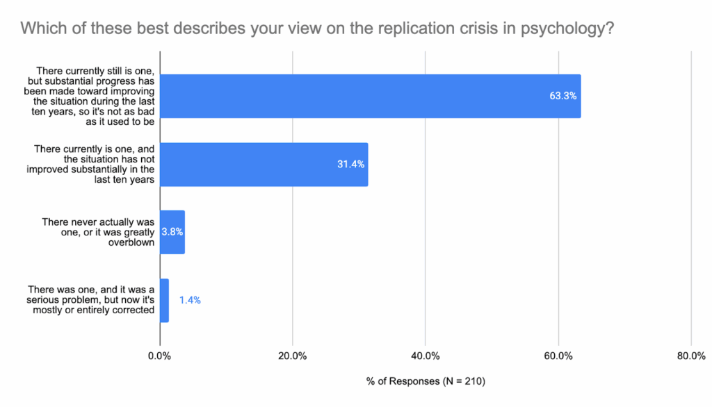 The poll almost perfectly agrees with Monya Baker’s 2016 poll in Nature, except most respondents now say “substantial progress has been made.” Baker’s poll found 90% of researchers believed there was a reproducibility crisis in science, and 52% said it was significant. The psychologists in the poll agreed (n = 44) at a slightly higher rate. In other words, 93% of psychologists would have used the word “crisis” then, and 95% would use it now except that most now believe a lot of progress has been made nonetheless.